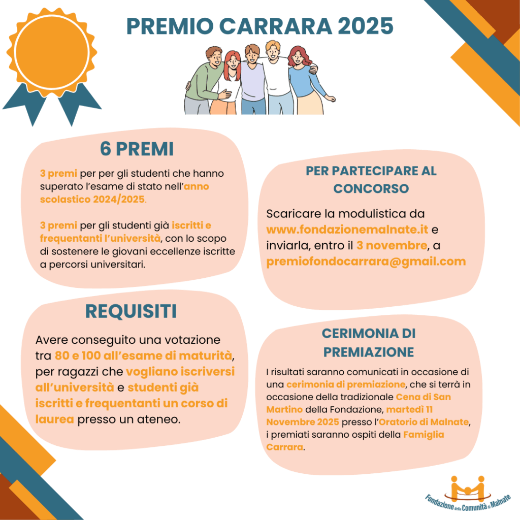 Il bando scade il 3 novembre, la cerimonia di premiazione si svolgerà martedì 11 novembre 2025, in occasione della Cena di San Martino organizzata dalla Fondazione della Comunità di Malnate presso il Salone dell’Oratorio Femminile di Malnate in Piazza San Martino.